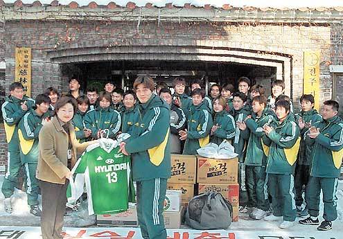 프로축구 전북 현대모터스 선수단 50명은 7일 전주시 완산구 효자동에 위치한 장애아동복지시설 ‘자림원’을 방문해 ‘1일 생활체험’을 했다. 선수단은 목욕보조와 대청소는 물론 원생들과 함께 오락시간을 갖는 등 장애아동들과 하나가 됐다. 최진철 선수(앞줄 오른쪽)가 심명숙 자림원 부원장에게 유니폼 등 기념품을 전달하고 있다.