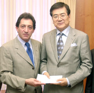 대한항공 조양호(趙亮鎬·오른쪽) 회장은 8일 서울 중구 정동 주한 러시아대사관을 찾아 러시아 남부 북오세티야공화국 베슬란의 인질사건 희생자 유가족을 돕기 위해 성금 3만달러를 테이무라스 라미슈빌리 대사에게 전달했다.