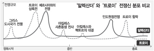 ‘알렉산더’의 첫 전쟁장면은 40분이 지나서야 시작된다. 이는 시작 5분 안에 화끈한 볼거리를 배치한다는 블록버스터의 ‘5분 법칙’이 적용됐던 ‘트로이’와 다른 점. 5개의 전쟁 신을 균형 분포시켰던 ‘트로이’와 달리 이 영화는 단 두 번의 전쟁 신을 시작 40분과 종료 전 30분 지점에 배치했다. 첫 40분 간 장황한 역사 강의를 들어야 했던 관객은 다음 전쟁 신까지 다시 1시간 15분을 기다려야 하는 것(그래픽 참조). 이는 볼거리보다 알렉산더의 내면을 파고들어가는 전략을 세운 이 영화를 따라다니는 그림자다.