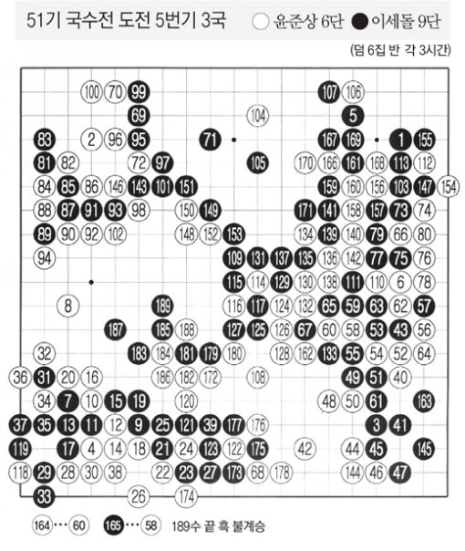 이 9단은 10일 서울 성동구 홍익동 한국기원에서 열린 51기 국수전 도전 5번기 3국에서 국수 윤준상 6단에게 189수 만에 흑 불계승을 거두며 통산 3-0으로 윤 6단을 물리쳤다.