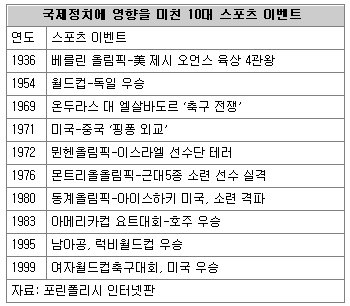 총성 없는 전쟁으로 불리는 스포츠는 국가 간의 관계를 직간접적으로 드러내 왔다. 미국 하버드대 국제정치학 교수인 스티븐 월트 씨는 최근 포린폴리시 인터넷판에서 국제정치에 영향을 미치거나 세계의 변화를 알려준 10대 스포츠 이벤트를 꼽았다.