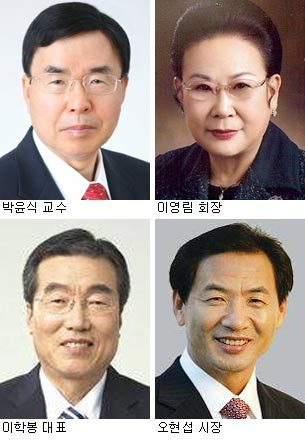 경희대총동문회는 ‘2010년 자랑스러운 경희인상’ 수상자로 박윤식 조지워싱턴대 교수(70), 이영림 사단법인 효애실천 회장(69), 이학봉 코레일유통㈜ 대표이사(62), 오현섭 여수시장(60) 등 4명을 선정했다고 11일 밝혔다. 시상식은 13일 오후 6시 반 서울 중구 소공동 롯데호텔 3층 사파이어볼룸에서 개최되는 ‘경희사랑 2010 신년교례회’에서 열린다.