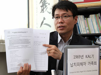 황인철 KAL기 납북피해자가족회 대표가 9일 서울 종로구 교북동 북한인권시민연합사무실에서 유엔에 제출한 실종자 관련 서류를 들어 보이고 있다. 양회성 기자