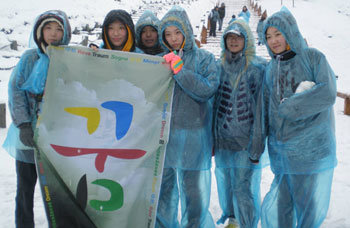 이달 3일 폭설이 내린 백두산에서 성신여대생들이 ‘대한민국 100년의 꿈’을 나타내는 플래카드를 펼쳐들었다. 이들이 중국 동북지역을 돌며 받은 중국인들의 꿈은 전 세계 2만100명의 꿈과 함께 대형 플래카드에 모아져 주요 20개국(G20) 정상회의 기간에 서울 종로구 세종로에 내걸린다. 다롄=최창봉 기자 ceric@donga.com