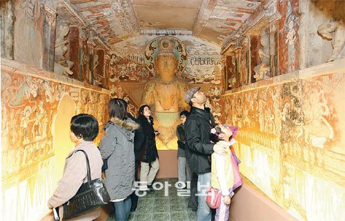 동아일보와 국립중앙박물관, MBC가 공동 주최하는 세계문명전 ‘실크로드와 둔황-혜초와 함께하는 서역기행’이 18일 개막했다. 19일 서울 용산구 국립중앙박물관 기획전시실에서 실크로드의 요충지인 둔황 막고굴 제275호 모형 내부를 둘러보고 있는 관람객들. 전시는 4월 3일까지 계속된다. 월요일 휴관. 1666-4252