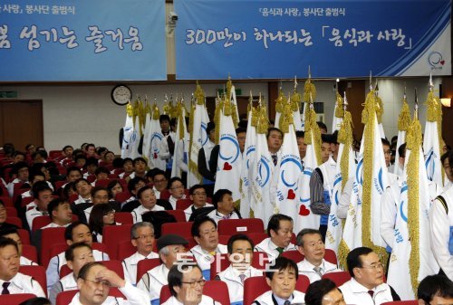 한국음식업중앙회가 27일 ‘300만이 하나 되어 시작하는 나눔과 섬김’을 슬로건으로 한 ‘음식과 사랑’ 봉사단을 출범시켰다. 이날 오후 서울 종로구 연지동 한국기독교연합회관에서 열린 출범식에는 남상만 한국음식업중앙회장을 비롯해 오세훈 서울시장 등 각계 인사 400여 명이 참석했다.