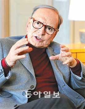 영화음악의 거장 엔니오 모리코네(83)가 16∼18일 서울 종로구 세종문화회관에서 열리는 50주년 기념 공연 ‘엔니오 모리코네 시네마 오케스트라’를 위해 12일 한국을 찾았다. 13일 오후 서울 광진구 워커힐호텔에서 만난 그는 오전에 있었던 리허설을 잠시 떠올렸다. 그는 이번 공연에서 국내 100인조 모스틀리 필하모닉 오케스트라를 지휘한다.