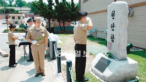천안함 용사… 주한 미 해군사령부는 5일 서울 용산 미군기지에 천안함 폭침 사건으로 숨진 해군 장병 46명과 한주호 준위를 기리는 추모비를 세웠다. 추모비 기단에는 ‘지키자 이 바다 생명을 다하여!(Let's defend this sea with all our lives!)’라는 문구가 한글과 로마자로 새겨졌다.