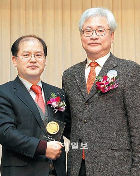 대한토목학회는 23일 서울 송파구 잠실롯데호텔에서 ‘2011년 한국토목문화대상’ 시상식을 열고 언론부문 대상에 황재성 동아일보 경제부 차장과 동아일보 4대강 특별취재팀을 공동 선정했다. 한국토목문화대상은 학술·기술·문화·언론 부문에서 토목기술 발전과 토목인 양성에 기여한 공로자에게 수여된다. 황 차장(왼쪽)과 이태식 대한토목학회장이 수상 직후 기념촬영을 했다.