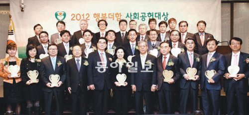 한국언론인협회와 동아일보가 공동 주최하고 스마트지식경영원이 주관한 ‘2012 행복더함사회공헌대상 시상식’이 6일 서울 중구 소공동 웨스틴조선호텔에서 열렸다. 사회공헌대상기업 대표들이 기념촬영을 하고 있다.