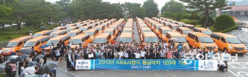11일 경기 과천시 서울경마공원에서 열린 한국마사회의 ‘사랑의 황금마차’ 기증식에서 장태평 회장을 비롯한 마사회 임직원과 차량을 기증받는 시설 관계자들이 기증 차량 앞에서 기념사진을 찍고 있다. 2004년 시작해 올해로 10년째인 사랑의 황금마차 기증은 농어촌 지역 장애인 재활시설과 지역 아동센터 등에 차량을 기부하는 사회공헌 사업이다. 마사회는 이날 120대를 포함해 10년 동안 모두 877대(210억4800만 원 상당)를 기증했다.