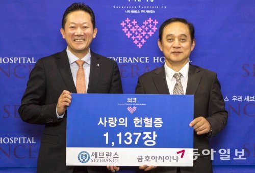 금호아시아나그룹은 2일 서울 서대문구 신촌동 연세대 세브란스병원에 임직원이 모은 헌혈증서 1137장을 전달했다고 밝혔다(사진). 기증된 헌혈증서는 저소득층 가정 아동과 희귀난치병을 앓는 어린이를 치료하는 데 쓰일 예정이다. 금호아시아나그룹은 2006년부터 전 계열사 차원에서 헌혈 운동을 진행하고 있다. 지금까지 임직원이 기증한 헌혈증서는 총 1만3613장에 이른다.