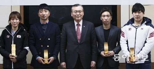 고려대가 소치 겨울올림픽에 참가한 선수 중 고려대 출신이거나 재학 중인 7명에게 6일 공로패를 수여했다. 왼쪽부터 조해리(쇼트트랙) 이규혁 선수(스피드스케이팅), 김병철 고려대 총장, 김윤재(쇼트트랙) 경성현 선수(알파인스키). 김연아 선수는 소속사에서 대리 참석했다.