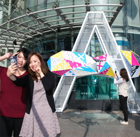 시민들이 6일 서울 종로구 청계천로 동아미디어센터 앞 상징물 ‘A트리’에 설치된 윤사비 작가의 설치미술작품 ‘산해경’ 앞에서 사진을 찍고 있다. 중국의 오래된 이야기책 제목이기도 한 ‘산해경’은 세상의 다양한 이야기를 펼쳐 보이는 자유로운 공간을 표현했다. 채널A는 일민미술관과 함께 공공미술프로젝트를 통해 A트리를 작품 설치 공간으로 개방할 계획이다.