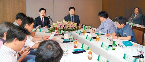한국신문방송편집인협회가 8일 오전 10시 서울 중구 한국프레스센터에서 개최한 ‘재난보도준칙 세미나’에서 황호택 협회장(오른쪽에서 다섯 번째)이 발언하고 있다. 이번 세미나는 지난해 9월 언론단체들이 공동으로 선포한 재난보도준칙 설명회를 겸한 것으로 심규선 동아일보 대기자가 주제 발표를, 안세득 KBS 과학재난부장이 사례 발표를 했다.