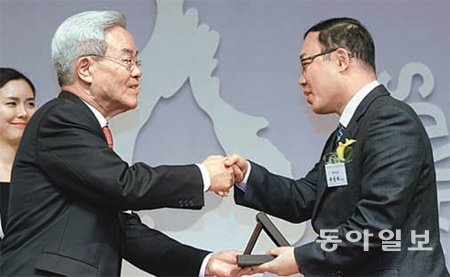 삼성언론재단 정창영 이사장(왼쪽)이 25일 서울 중구 한국프레스센터 20층 국제회의장에서 본보 국제부 주성하 기자에게 제20회 삼성언론상을 시상하고 있다. 김일성대를 졸업한 탈북자인 주 기자는 ‘서울과 평양 사이’ 등 칼럼과 기사를 통해 북한의 실상과 문제점을 냉정하면서도 심도 있게 한국과 국제사회에 전달한 공로로 올해 신설된 전문기자상 수상자로 선정됐다.