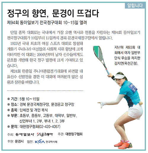 제94회 동아일보기 전국정구대회 10 ~15일 열려
