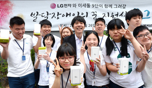 이세돌 9단(가운데)이 26일 서울 노원구 노원로 성민복지관에서 열린 ‘발달장애인의 꿈 지원식’ 행사에서 학생들에게 LG전자 스마트폰 ‘G5’를 선물한