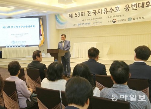 21일 서울 중구 한국자유총연맹 대강당에서 열린 제53회 전국 자유수호 웅변대회에 앞서 김경재 자유총연맹 중앙회장이 인사말을 하고 있다. 지역 예선 등을 거쳐 18명이 참가한 이날 대회에서는 김정민 군(한국외국어대부고 1학년)이 대통령상의 영예를 안았다.