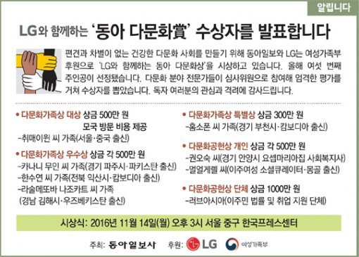 [알립니다]LG와 함께하는 '동아 다문화賞' 수상자를 발표합니다