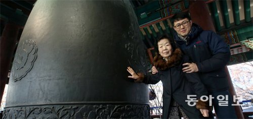 남편 고 조진호 씨와 함께 44년간 보신각종을 지켜온 아내 정부남 씨(왼쪽)가 업무를 이어받은 신철민 서울시 주무관과 함께 포즈를 취했다. 지금도 보신각종을 ‘종님’이라고 부르는 그는 “단 하루도 집에 들어오지 않고 종님을 지킬 정도로 남편과 시댁 어른들의 종님에 대한 사랑은 대단했다”고 말했다. 장승윤 기자 tomato99@donga.com