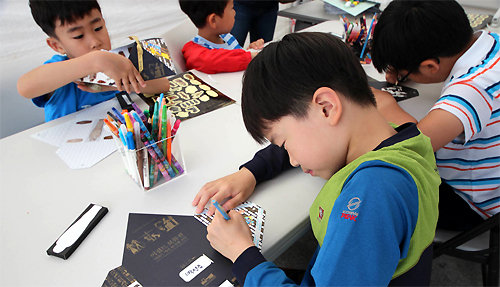 울산박물관을 찾은 어린이들이 ‘이집트 보물전’과 연계된 피라미드 만들기 체험에 참여하고 있다. 울산박물관 제공
