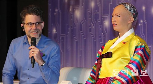 인공지능(AI) 로봇 ‘소피아(오른쪽)’가 30일 오전 서울 중구 더플라자호텔에서 열린 콘퍼런스에서 ‘로봇의 기본 권리’를 주제로 다양한 질문에 대답하고 있다. 소피아가 입은 한복은 박술녀 한복 디자이너가 만들었다. 왼쪽은 소피아를 개발한 핸슨로보틱스의 데이비드 핸슨 대표. 전영한 기자 scoopjyh@donga.com