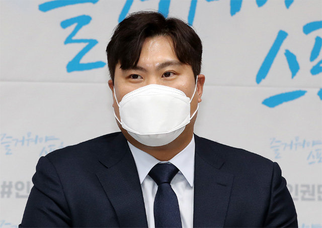 국가인권위원회 홍보대사 류현진이 3일 서울 중구 국가인권위원회 사무실을 찾아 취재진의 질문에 답하고 있다. 뉴스1