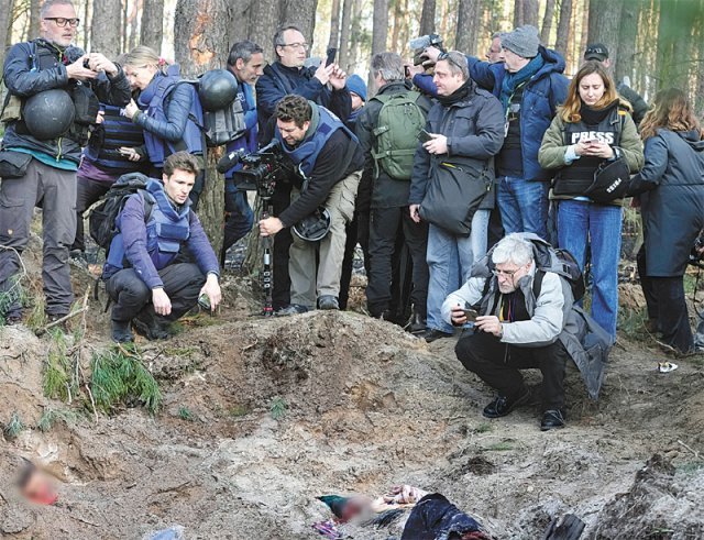 지난달 4일(현지 시간) 우크라이나 언론인들이 수도 키이우 외곽 소도시 부차에서 러시아군의 민간인 집단 학살 현장을 취재하고 있다. 9일 미국 퓰리처상 선정위원회는 러시아군의 각종 만행을 전 세계에 알린 공로로 우크라이나 언론인 전체에 퓰리처상 특별상을 수여했다. 부차=AP 뉴시스