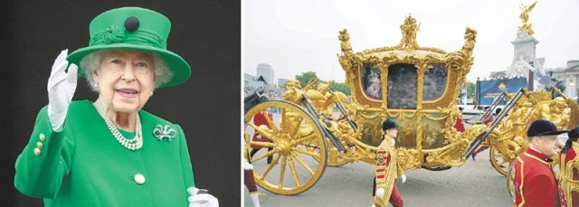 손을 흔들고 있다(왼쪽 사진). 이날 버킹엄궁 앞에는 황금마차가 등장했다. 여왕이 1952년 즉위식 때 탔던 이 마차는