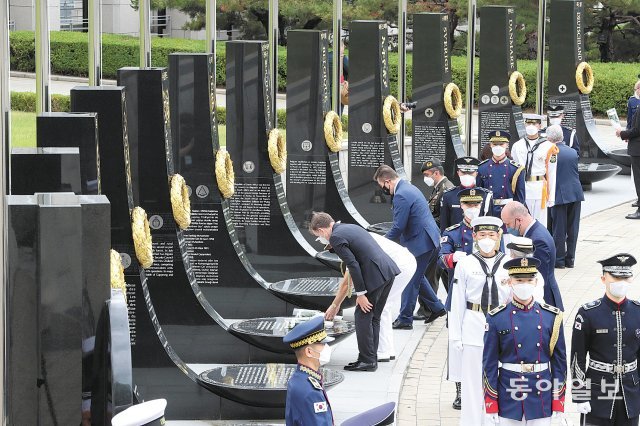 전국경제인연합회가 16일 서울 용산구 전쟁기념관에서 개최한 ‘한국전 참전국 초청 감사회’에서 참전 22개국 대사 및 대사관 소속 군인들이 참전비에 헌화하고 있다. 전영한 기자 scoopjyh@donga.com
