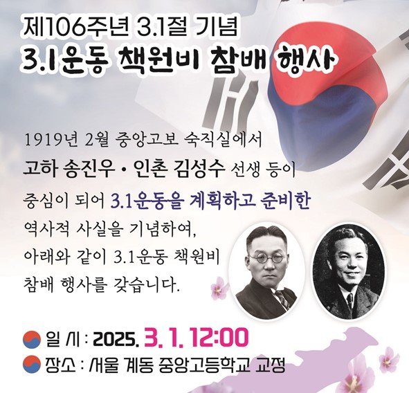 인촌사랑방은 내달 1일 낮 12시 서울 종로구 계동 중앙고등학교 교정에서 3·1운동 책원비 참배 행사를 연다고 27일 밝혔다.