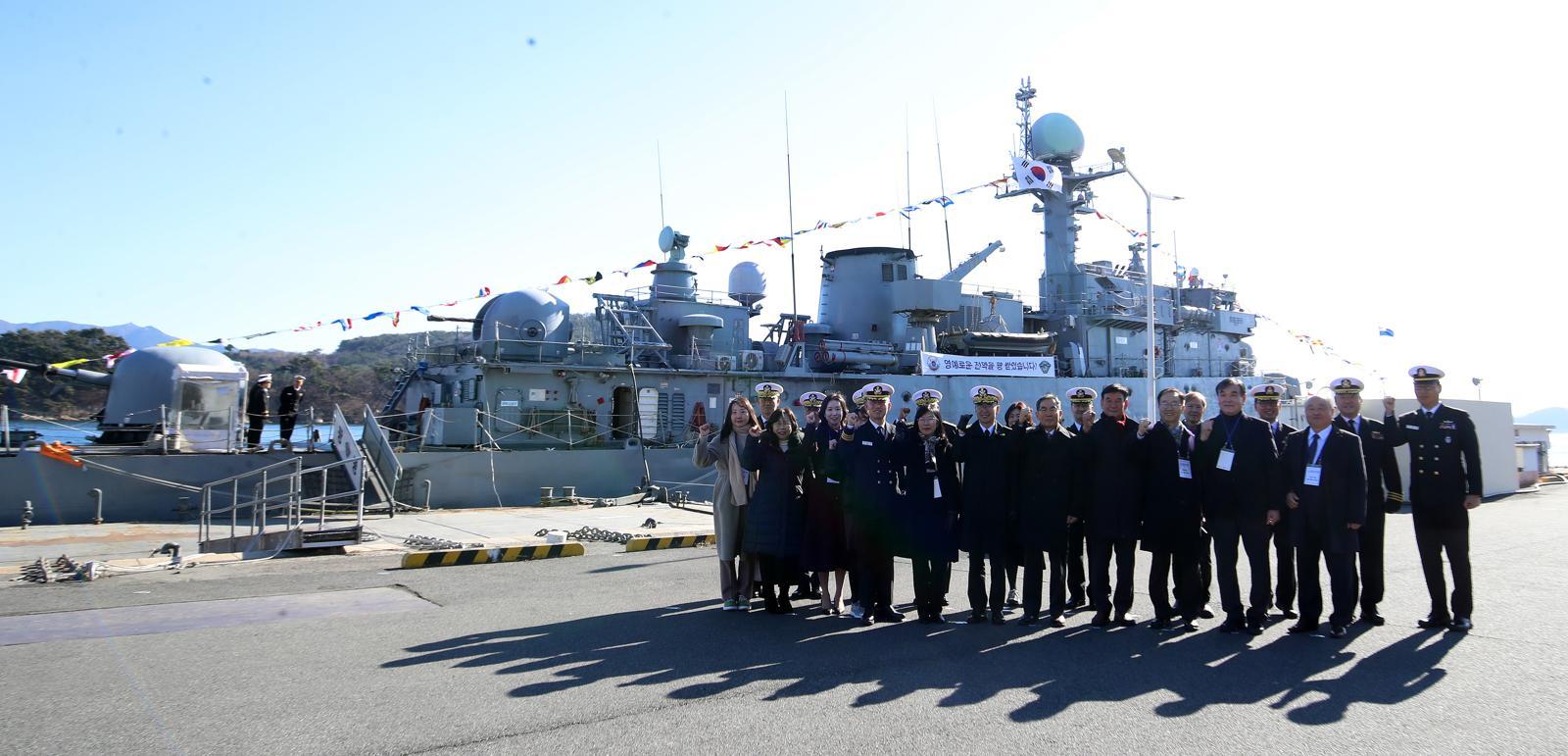 26일 경남 창원 진해 군항에서 열린 국산 초계함(PCC) 광명함(1000t급) 전역식에서 역대 함장 등 참석자들이 기념 촬영을 하고 있다. 1990년 취역한 광명함은 1998년 12월 전남 여수 앞바다에 침투한 북한의 반(半)잠수정을 격침하는 등 해역 방어의 핵심 전력으로 활약했다.