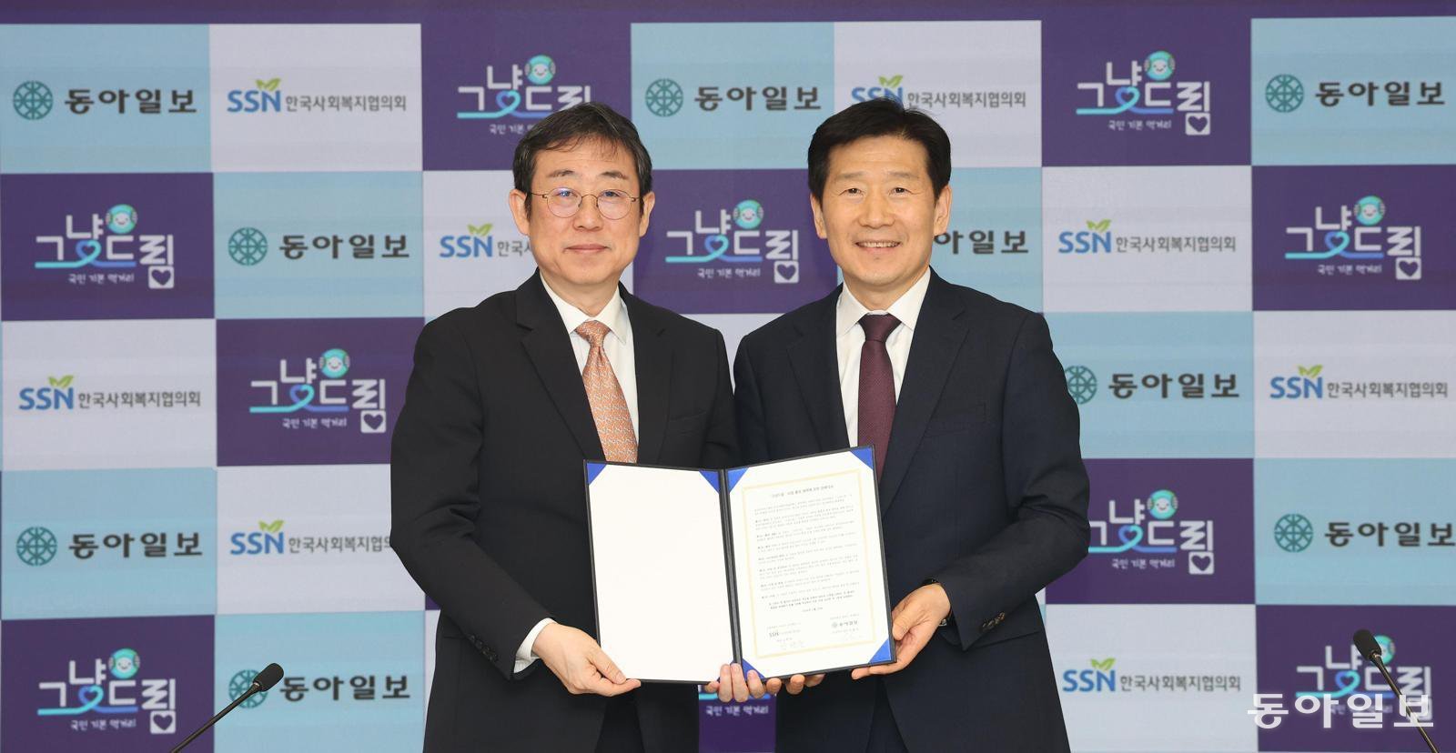 김현훈 한국사회복지협의회장(오른쪽)과 동아일보 천광암 논설주간이 23일 서울 종로구 동아미디어센터에서 전 국민 먹거리 보장 사업인 ‘그냥드림’ 업무협약을 맺은 뒤 기념 촬영을 하고 있다. 그냥드림은 사회 안전망 강화를 위해 취약계층에게 먹거리와 생필품을 지원하는 보건복지부 사업이다.