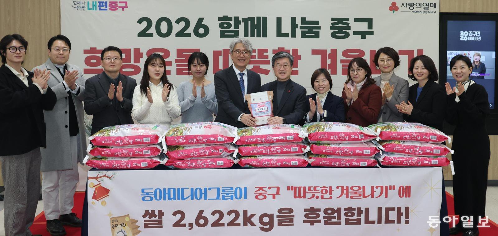 10일 서울 중구청에서 동아일보사 직원들이 김길성 구청장(오른쪽에서 여섯 번째)이 참석한 가운데 쌀 2622kg을 중구 ‘2026 희망온돌 따뜻한 겨울나기’ 사업에 기부했다. 따뜻한 겨울나기는 서울시와 서울사회복지공동모금회가 함께 추진하는 캠페인으로, 주민과 단체, 기업이 함께 매년 지역사회의 어려운 이웃에게 따뜻한 손길을 전하는 나눔 활동이다.