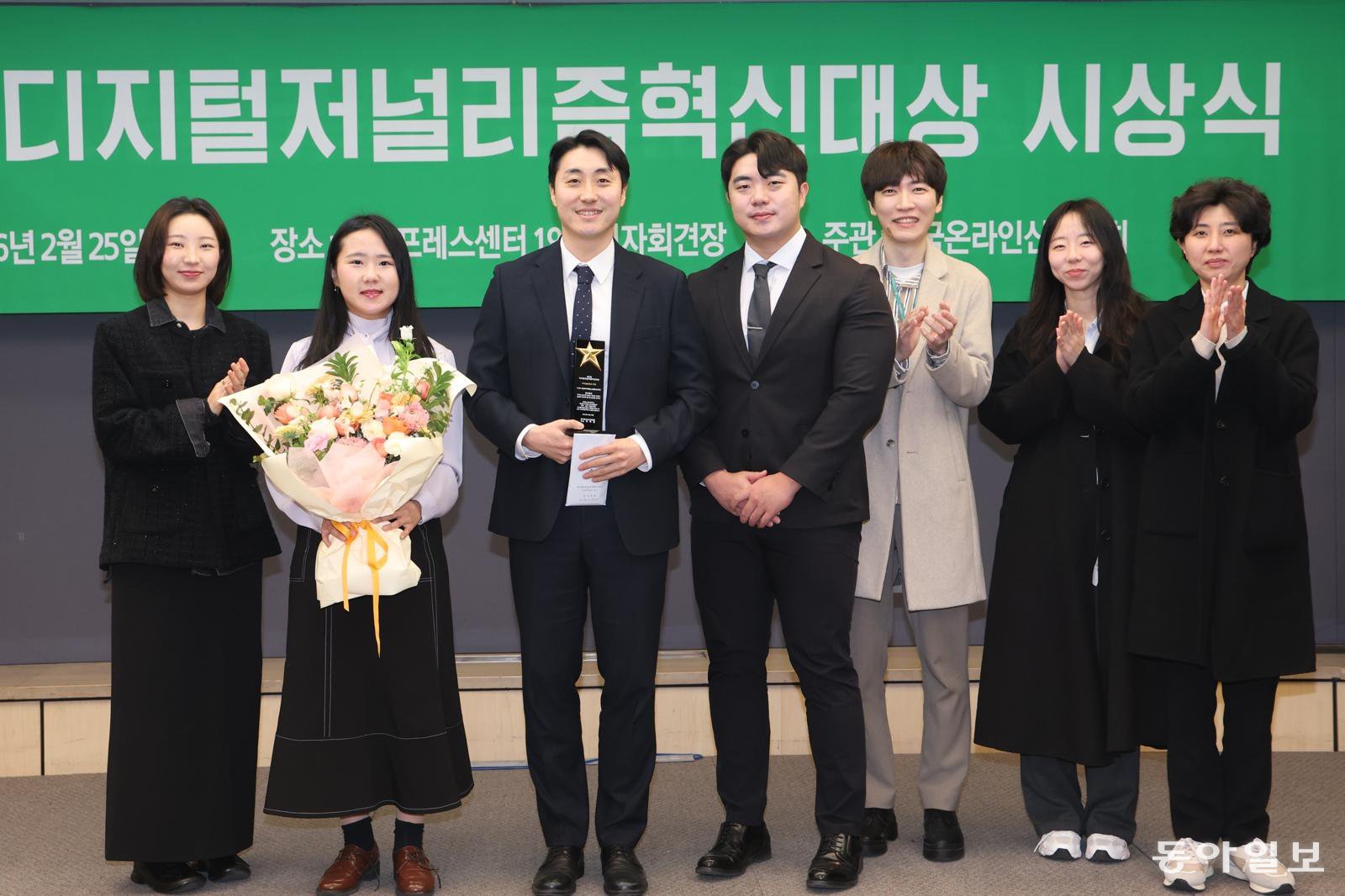 25일 서울 중구 한국프레스센터에서 열린 제3회 디지털저널리즘혁신대상 시상식에서 ‘누락: 당신의 아파트는 안녕하신가요’ 인터랙티브 기획을 제작한 동아일보 히어로콘텐츠팀이 디지털 콘텐츠 부문 대상을 수상했다. 왼쪽부터 정시은 크리에이티브 디렉터, 김수현 구특교 이문수 기자, 임희래 임상아 뉴스룸 디벨로퍼(ND), 김지희 PD.