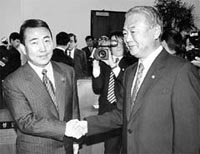29일 국회 환경노동위에서 교원노조 설립 및 운영에 관한 법안이 통과된 뒤 이기호노동부장관(왼쪽)과 김범명환경노동위원장이 악수를 나누고 있다.<석동률기자>
