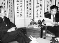 5일 오전 국회에서 국민회의 박상천원내총무(오른쪽)와 한나라당 이부영총무가 '언론대책문건'파문에 대한 국정조사문제를 논의했으나 여야 모두 기존의 입장을 되풀이해 회담은 결렬됐다.