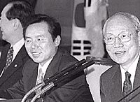 28일 오후 서울 여의도당사에서 열린 민주당 당무회의에서 서영훈대표(오른쪽)등 당직자들이 공천심사특위 구성을 논의하고 있다.〈이훈구기자〉