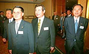 박재규통일부장관 한광옥대통령비서실장 박지원문화관광부장관(오른쪽부터)이 7일 서울 스위스그랜드호텔에서 열린 남북정상회담 대표단 상견례 식장에 밝은 표정으로 들어서고 있다.