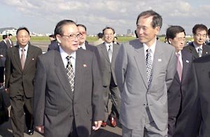 제3차 남북 장관급회담을 위해 27일 오후 제주공항에 도착한 북한 전금진 내각책인참사(앞줄 왼쪽)가 박재규 통일부장관의 안내로 귀빈실로 향하고 있다. <제주=이종승기자>