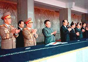 북한 노동당 창건 기념일인 10일 평양의 김일성광장 주석단에서 열병 및 군중시위를 보면서 박수를 치고 있는 북한 지도부. (왼쪽부터) 김일철 인민무력부장, 김영춘 인민군 총참모장, 김정일 국방위원장, 김영남 최고인민회의 상임위원장의 모습이 보인다.