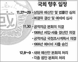 국회상황도 마찬가지다. 당장 시급한 공적자금 문제에 대해서도 여야의 이견이 해소된 것은 아니다. 민주당은 정부가 제출한 40조원의 일괄통과를 바라고 있으나, 한나라당은 “자금 소요 항목을 면밀히 검토한 뒤 결정하겠다”는 입장이다. 한나라당은 또 공적자금관리특별법 제정과 공적자금의 국회동의를 연계시키고 있다.