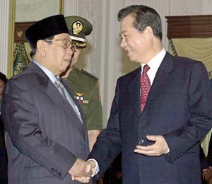 인도네시아를 방문 중인 김대중대통령이 28일 압둘라만 와히드 인도네시아대통령과 정상회담에 앞서 악수를 하고 있다. <자카르타= 서영수기자>