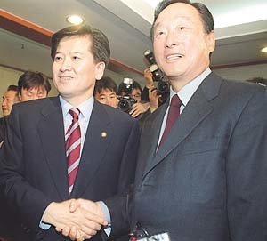 7일 오전 여의도 당사에서 열린 민주당 최고위원회의가 끝난 뒤 권노갑 최고위원(오른쪽)과 정동영 최고위원이 웃으면서 악수를 하고 있다. <석동률기자>