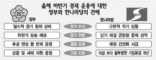 한나라당은 최근 당내 회의에서 보고한 ‘정부의 하반기 경제 운용 방향에 대한 평가’에서 정부의 상황 인식 자체를 문제삼았다. 정부가 올해 경제 성장률을 당초 전망(5∼6%)보다 낮은 4∼5%로 조정하면서 내년 이후에는 5∼6%대의 성장세가 지속될 것이라고 했지만, 이는 수출증가율과 설비투자증가율이 계속 마이너스를 보이고 있는 실정 등을 감안할 때 지나치게 낙관적이라는 것.