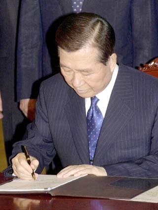 김대중 대통령이 20일 청와대에서 부패방지법에 서명하고 있다.<서영수 기자>