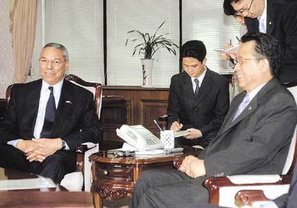 한승수 외교통상부장관과 콜린 파월 미 국무장관이 27일 서울 세종로 정부중앙청사에서 회담을 갖기에 앞서 환담하고 있다.<사진공동취재단>