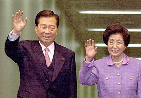 김대중 대통령과 부인 이희호 여사가 2일 오후 노벨평화상 심포지움 참석 등 유럽순방을 떠나면서 서울공항에 출영나온 내빈들에게 손을 흔들어 보이고 있다. <이훈구기자>