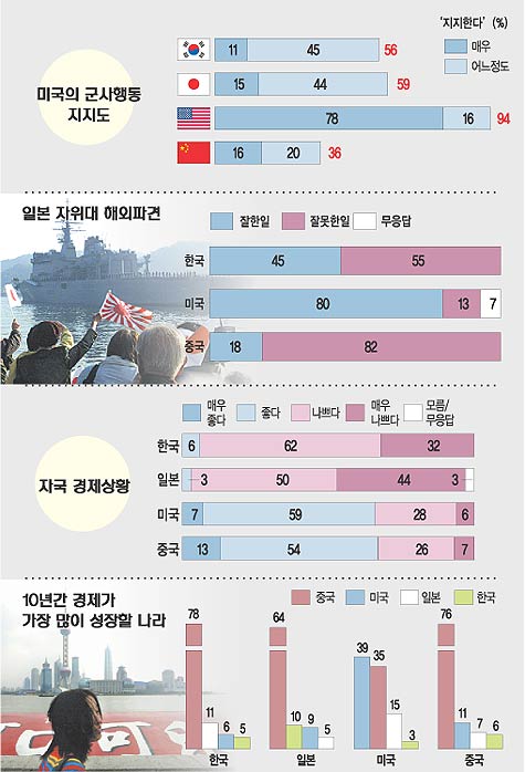 그래서인지 한 일 미국의 국민은 중국을 경제면에서 서로 협력할 수 있는 ‘파트너’로 생각하는 경우보다 서로 경쟁하는 ‘라이벌’이라고 인식하는 경우가 4 대 6 정도의 비율로 높았다.